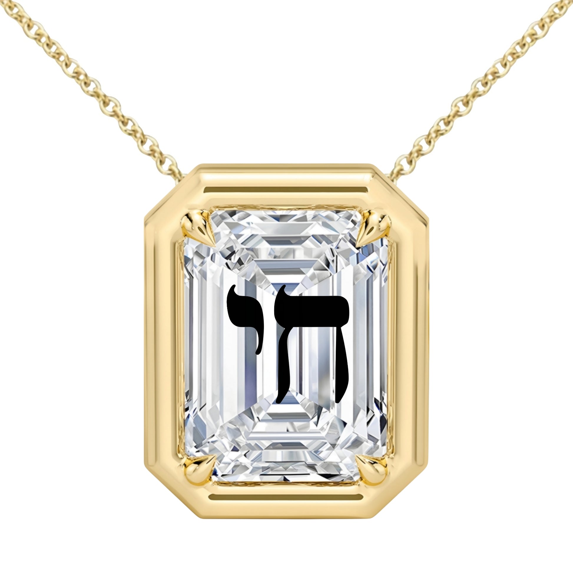 Laser Engrave On Lab Grown Diamond Emerald Bezel Prongs Pendant Chai Engraved Necklace 14K Gold
