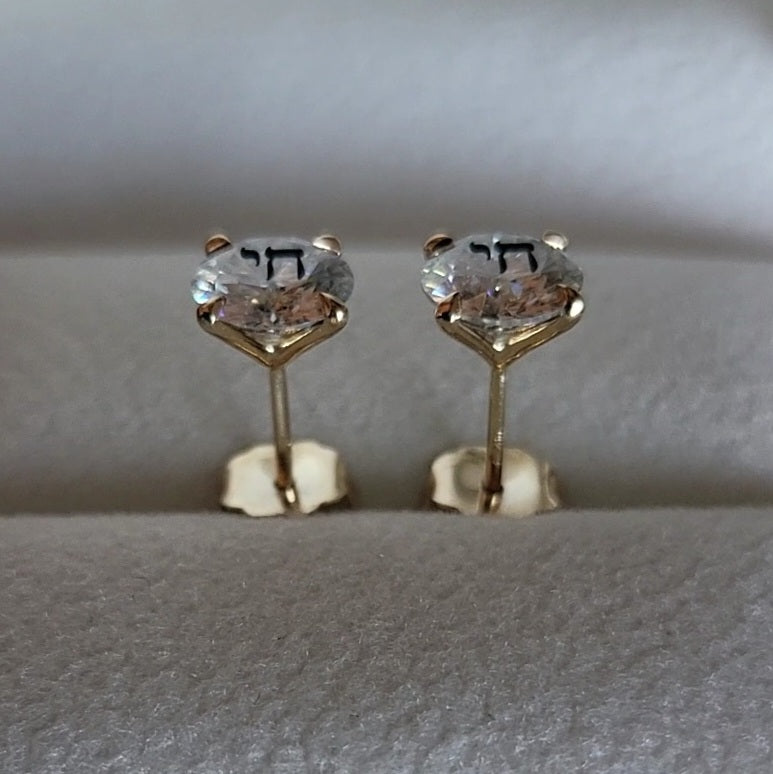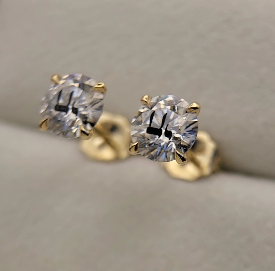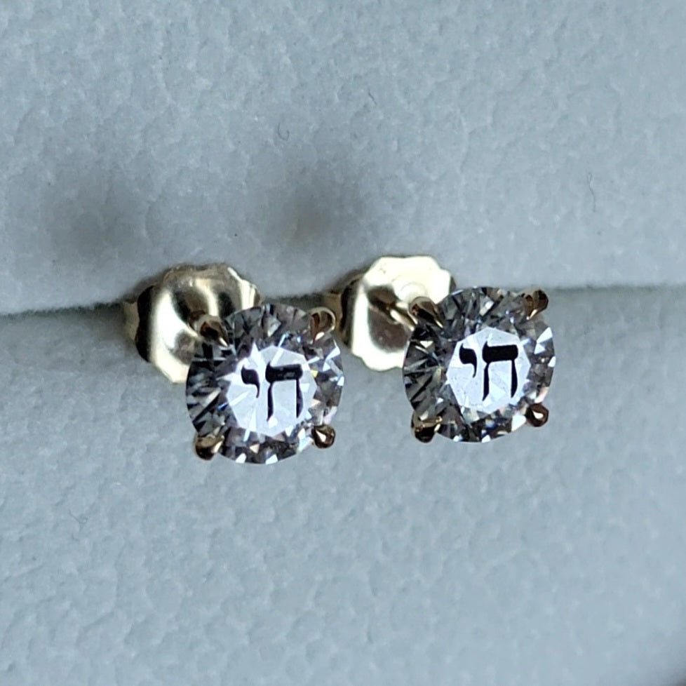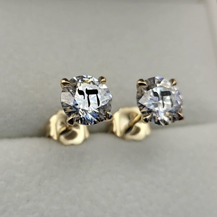 זוג עגילי אבן מוסונייט עגולים עם חריטת לייזר חי – זהב 14 קראט צהוב/לבן/רוז גולד – עגיל ייחודי עם מסר רוחני