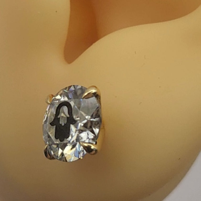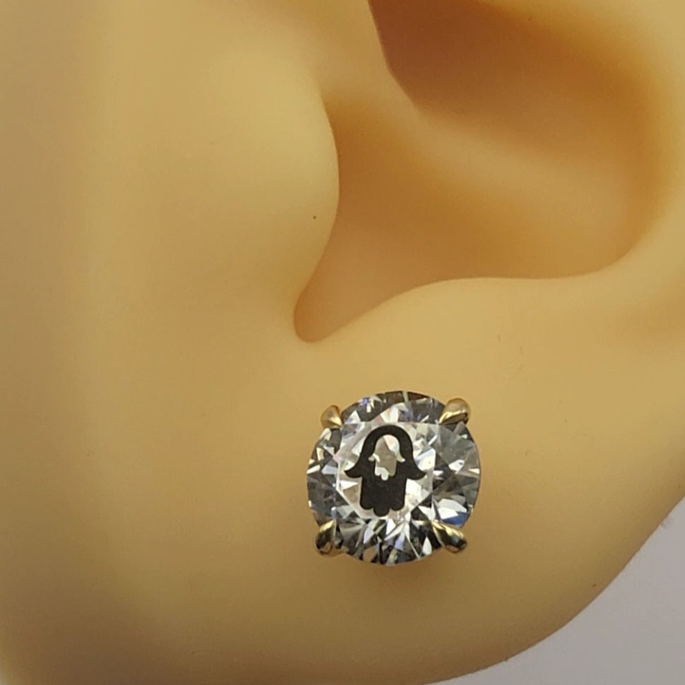עגיל יהלום מעבדה עגול עם חריטת לייזר חמסה בחמסה – זהב 14 קראט צהוב/לבן/רוז גולד – עגיל ייחודי עם מסר רוחני